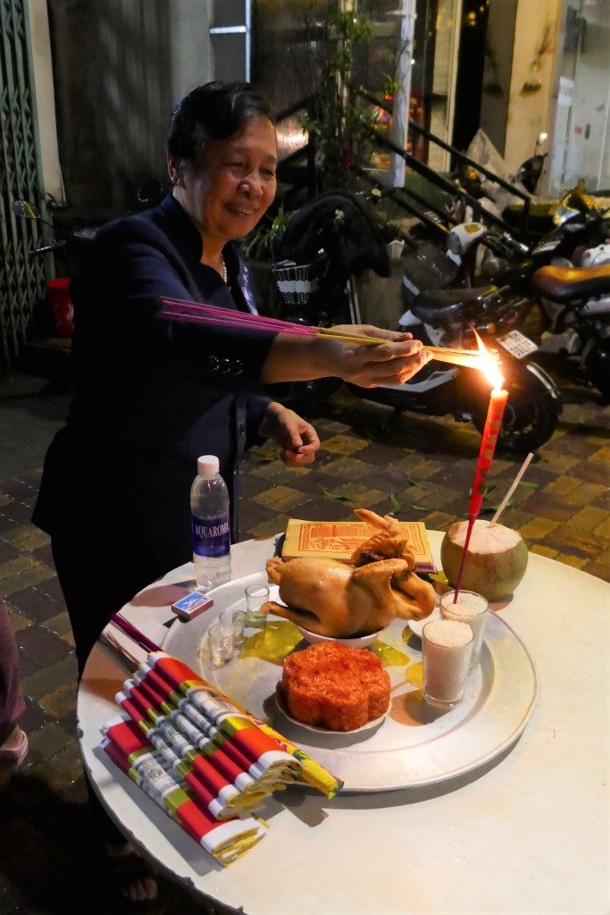 Als de hagel en regen is gestopt, verkennen wij de stad verder. Er is weinig activiteit te vinden, behalve een oudere vrouw die voor haar huis een altaar opbouwt. Voor ieder huis zien we zo’n altaar staan, waar geofferd wordt en wierook wordt gebrand om overleden voorouders uit te nodigen voor TET. De vrouw lacht ons vriendelijk toe. Ze zegt ook het één en ander tegen ons, maar dat Vietnamees is aan ons nog steeds niet besteedt. Een jongere vrouw komt naar buiten en vertelt ons in perfect Engels dat haar moeder ons uitnodigt om met haar familie oudjaarsavond te vieren. Na enige twijfeling (zitten we ze niet in de weg? TET is tenslotte een familie aangelegenheid?) wint onze nieuwsgierigheid het van onze twijfel en gaan we naar binnen. De familie blijkt naast vader en moeder, uit twee dochters, een schoonzoon en 4 (klein)kinderen te bestaan. De dochters spreken goed Engels, wonen in (de buurt van) Hanoi en hebben goede banen. Het is leuk om wat meer te weten te komen over de gebruiken van Vietnam en met name tijdens TET. Om middernacht gaat de hele familie naar buiten om vanaf de brug het vuurwerk te bekijken. In Vietnam wordt alleen georganiseerd vuurwerk door militairen afgestoken, consumentenvuurwerk blijkt verboden. Dat zal in Nederland nog wel een paar jaar duren! Opvallend is dat er verder niet zo heel veel gebeurt. Er wordt een gelukkig nieuwjaar gewenst, een zinnetje waar wij hard op hadden geoefend: chuc mung nam moi. Maar dat is het. Geen zoenen, of omhelzingen, geen uitbundigheid. Iedereen heeft een grote glimlach, iedereen is opgeruimd, dat wel, maar van een feeststemming is geen sprake. We worden uitgenodigd om de volgende ochtend aan te schuiven voor het nieuwjaarsontbijt. Dat slaan we zeker niet af. Dat ontbijt is overigens wel om 8 uur, dus dat wordt vroeg opstaan.
