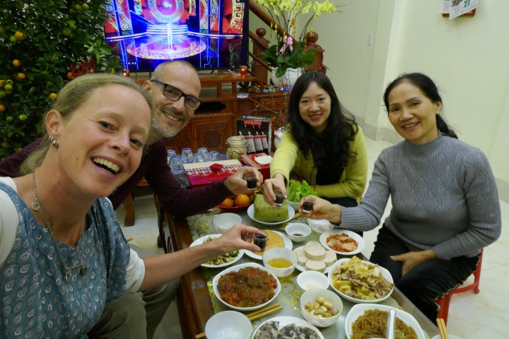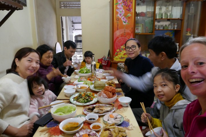 Thuis hebben we net de koffie doorgeslikt en de eerste foto’s (nog van China, zucht) bekeken, als de eigenaresse van het guesthouse binnen komt. Of we met hun samen willen lunchen? Uiteraard kunnen we daar geen weerstand tegen bieden. Onze berg ingeslagen eten moet nog maar wat langer op ons wachten. En nee natuurlijk hebben we geen trek of überhaupt eetlust, het is alleen zo geweldig om de kans te krijgen, overal een graantje TET mee te kunnen pikken. Zo zitten we weer aan een tafel vol eten. We proberen gedoseerd te eten, maar regelmatig worden onze kommetjes gevuld. En alcohol (wijn, dit keer) mag natuurlijk niet ontbreken. We worden ‘gered’ door een partij gasten die voor de deur staan; allemaal familie. We bieden snel aan plaats te maken. Dat blijkt niet nodig, maar de heel gematigde protesten maken wel duidelijk dat het een goed moment is te gaan 😉.