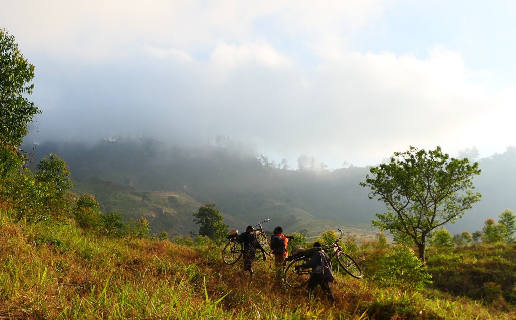Zodra ik uitgegeten en uit gefotografeerd ben zitten de mannen klaar voor de verkoop. Om ze te vriend te houden en een dagloon te bezorgen koop ik voor 5.000 (€2,50) wat bij beide (ook de heerlijke gooseberries!) en heb ik een paar stenen die ik niet perse wil hebben, en dan keer ik huiswaarts. Geen andere detour, want ik ben bang dat mijn batterij en mijn niet-gefilterde 500ml water me niet ver gaan brengen… Bovendien heb ik er al 13km en 1000 hoogtemeters op zitten.