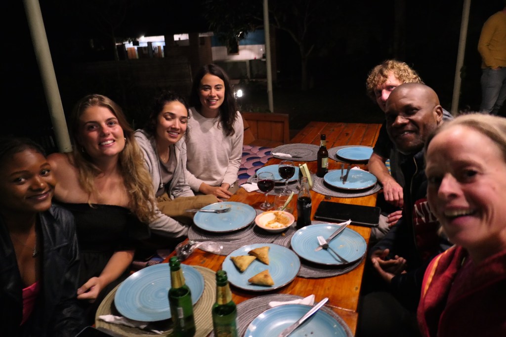 Pam zit samen met Kendi die me vrolijk begroet alsof er niets aan de hand is, laat staan mediation heeft plaats gevonden… Nou ja, beter een poppenkast dan een moeizaam samenzijn, want het is Pam haar verjaardag en dat moet gezellig zijn en als we maar lang genoeg acteren gaan we zelf in het plaatje geloven en zo kan het ook vanzelf goed komen. Nog geen paar minuten later komt Sophia en gelukkig breiden we dan snel verder uit tot we op een hele natuurlijke manier gesprekken met anderen kunnen voeren zonder dat het ongemakkelijk wordt. Pam is nog niet zo lang terug in Malawi en heeft zowel azungus als Malawiërs uitgenodigd en met erg veel plezier eten we super lekker bij Blend. Blend is het lokale hostel/hotel met Nederlandse eigenaren. Wauw wat heerlijk om zo ontspannen te zijn! Uitgebreid tafelen, ontspanning in de gespannen sfeer, 2 biertjes en een wijntje na een eeuwigheid niet te hebben gedronken, interessante gesprekken, leuk gezelschap, in de avond ‘uit’, wauw! Thanks Pam!