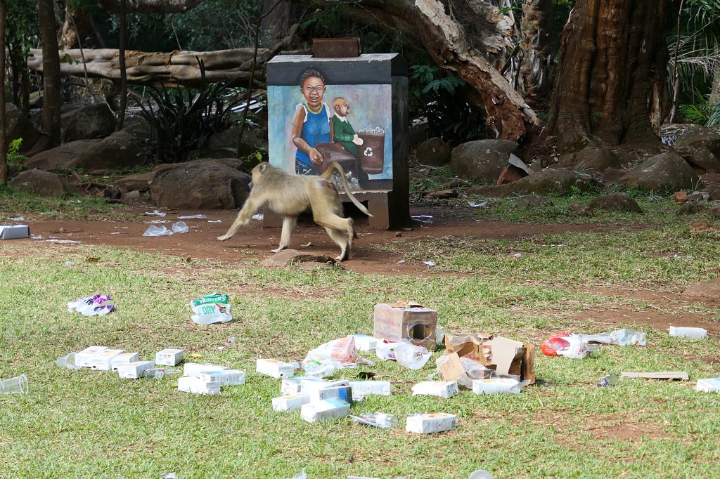 Zoals elke weekend heb ik een moment nodig mijn ondergoed te wassen, wat op te ruimen en te organiseren, maar als ik klaar ben, is Laurel uitgewandeld en kunnen we samen de Botanische tuin ontdekken. Voor 500 kwacha (€0,25) kan ik mijn lol wel op, want het is een bavianenparadijs en vooral bij de entree is het een drukte van belang.