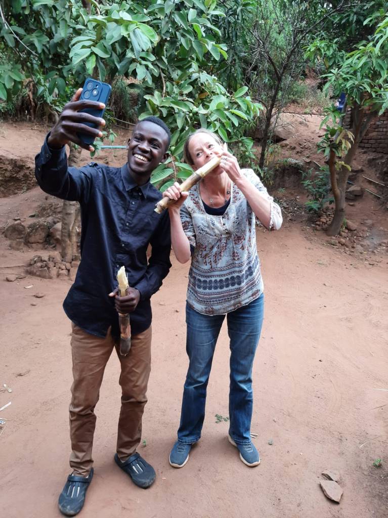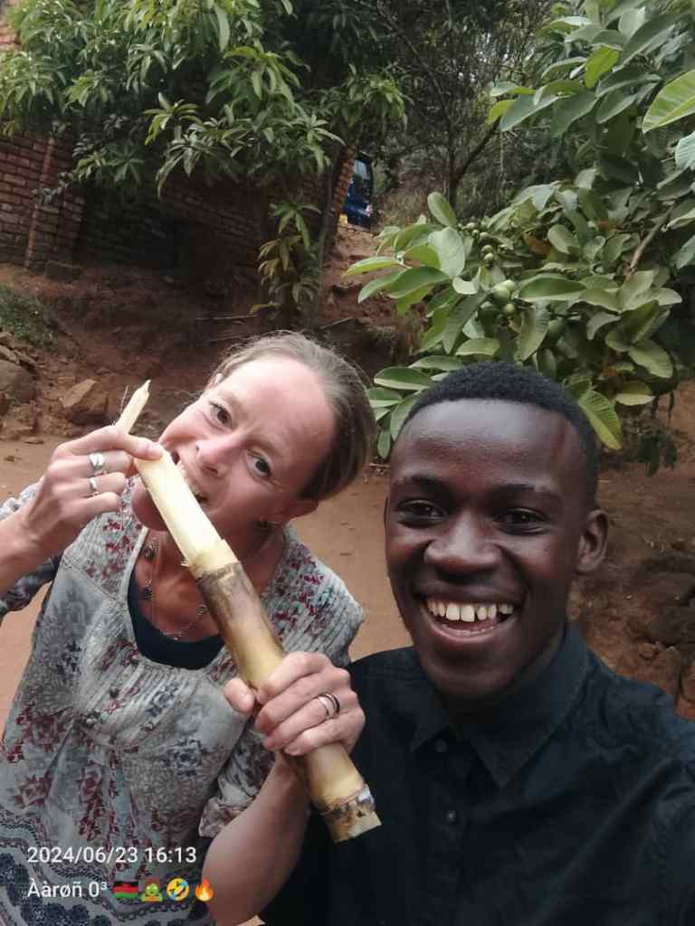 Na een snelle en erg lekkere lunch bij Lala, ben ik klokslag 14u thuis en zit mijn volgende afspraak al op me te wachten. Loveness is onze schoonmaakster en heeft me bij haar uitgenodigd en komt me halen. Super leuk en het fijne is, is dat ze ook erg goed Engels praat, wat niet de standaard is bij de lager betaalde banen hier. Ze neemt me mee naar haar huis met haar 2 zonen en nog een vriendin van haar. Onderweg hakt ze suikerriet van haar land en de zonen leren me hoe ik dat moet eten. Zelf pakken ze het van de grond op om met de tanden de buitenkant af te bijten, maar heel schattig, wassen ze (gelukkig) voor mij eerst de suikerriet af voor ik de grond mag proeven 😉. Het is echt een groot succes, de zonen zijn supertrots een azungu in huis te hebben en ik ben superblij en trots te zijn uitgenodigd en megaleuke gesprekken te hebben. We leren van elkaar, doen hele fotosessies, sluiten het bezoek af met een gebed, om vervolgens onder begeleiding van de zonen weer naar huis te wandelen.