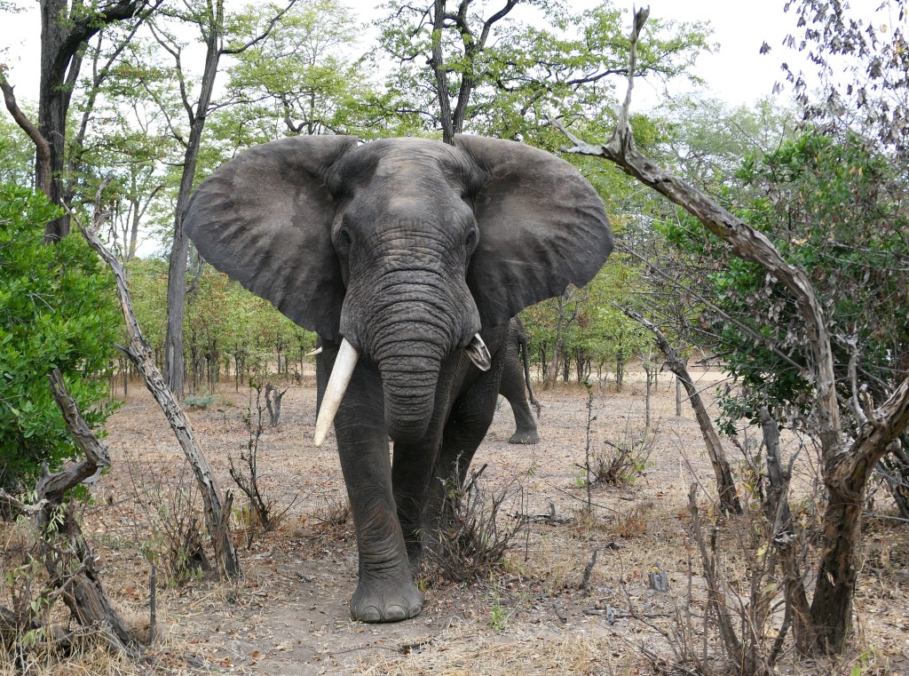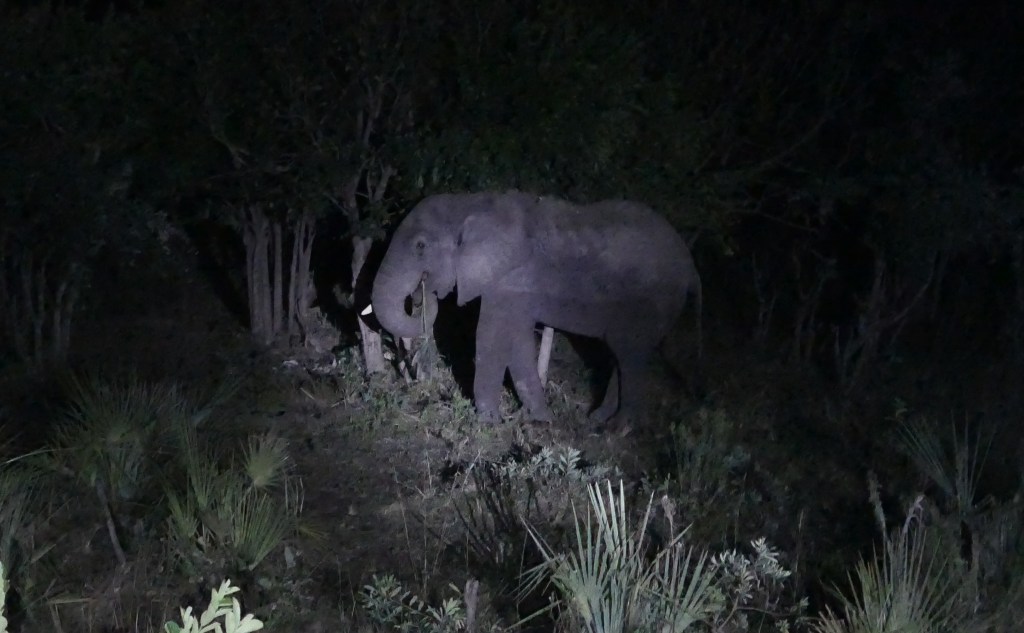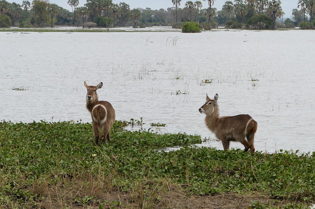 Terug aan wal is duidelijk dat de logde midden in het park ligt, de bushbucks en wilde zwijnen zijn vlakbij de lodge. Ook als we later in de avond op de uitkijkposten staan, zien we een olifant en nijlpaard op 50m afstand. Reden ook dat we bewaking hebben, zij houden ons tegen te ver van het kamp te lopen en de dieren op afstand.