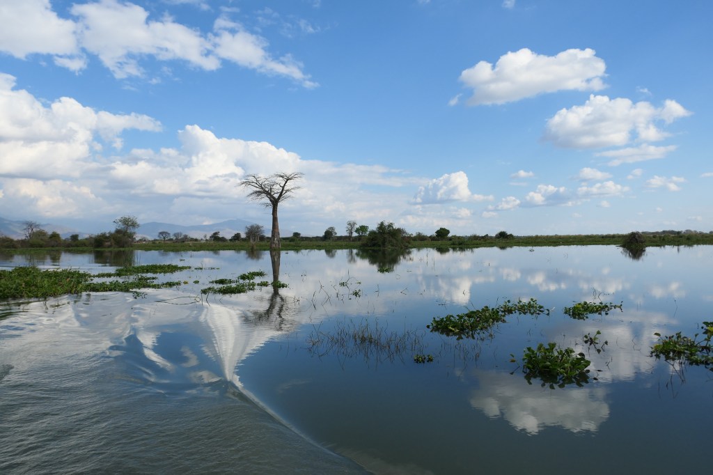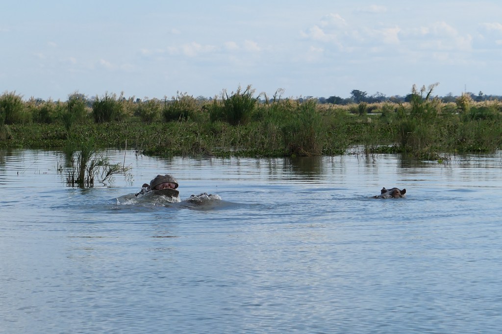 Dit keer zijn we met 6 personen met nog 2 Britten erbij. We stappen op de boot en worden weer voorzien van wildlife, in de verte hier en daar hetzelfde op het land, maar in het water zijn het vooral de nijlpaarden. De vraag heerst of ze kunnen zwemmen of alleen kunnen lopen in het water en ze kunnen maar liefst 5-6minuten onder water blijven! Machtige beesten, ook wel gevaarlijk dus we blijven op afstand.  We zien tevens krokodillen, maar die vinden ons blijkbaar gevaarlijk want die verdwijnen snel zodra we ze met moeite spotten. De boottocht zelf is prachtig en vanwege mijn vogel-interesse bezoeken we vogelbroedplaatsen. We keren terug als op mijn camera-accu het genoeg vindt geweest. Nou ja 400 foto’s is ook wel een beetje veel….