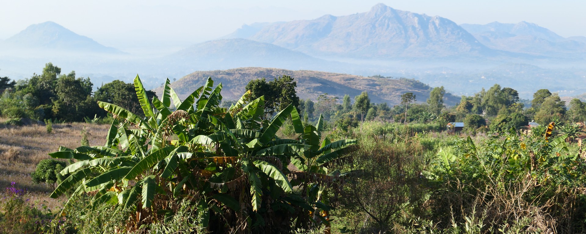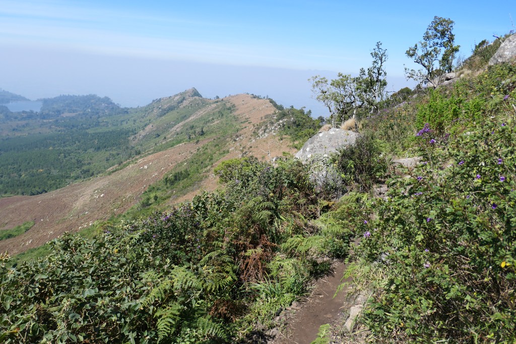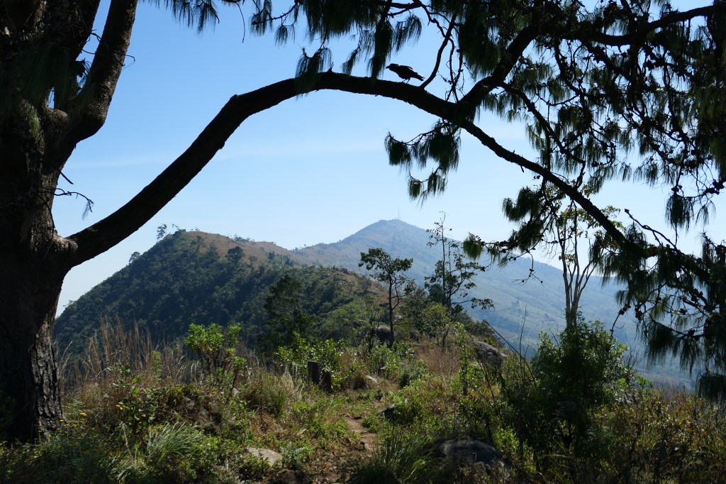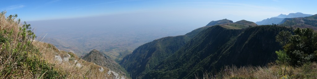 Vanaf daar loop ik de ‘ridge walk’, mijn nieuw bedachte doel en dat is daadwerkelijk een ridge= bergkam met aan 2 kanten een dal, het plateau 100-200m onder me, Zomba zo’n 1000m lager. Ondanks of dankzij de smog is het erg mooi. Ik geniet volop. Ik kom één azungu gezin tegen en een enkele bewoner, maar verder geen wandelaars. Had ik ook niet verwacht, want het is zondag en dan zit iedereen in de kerk.