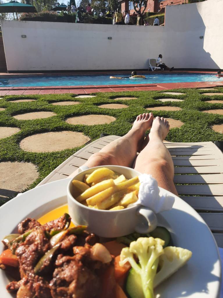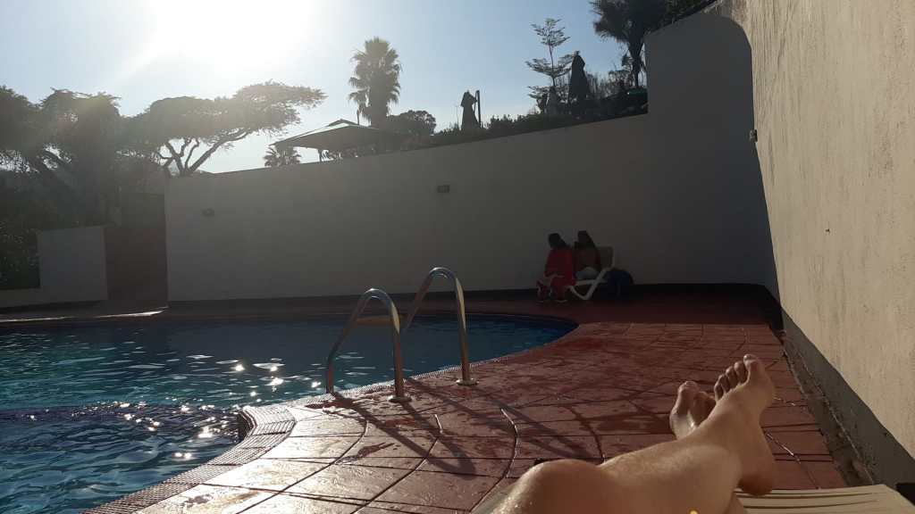 De vermoeidheid slaat toe, de laatste kilometers -naar beneden- gaan steeds trager en de pauzes nemen toe, maar voor 14u heb ik er 17km in netto 4,5u (bruto dus 7,5u) op zitten en ben ik bij hotel Sunbird. Ik heb al 2-3u naar dit punt uitgekeken en niet alleen letterlijk… want hier is mijn beloning; het zwembad!