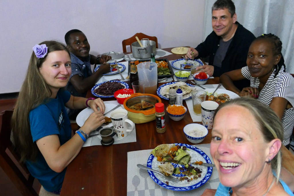 Omdat we gisteren goddelijk hebben gegeten en nog steeds behoorlijk veel eten over hebben, nodigen Ellis en ik last minute weer even wat mensen uit om alles op te eten. Allereerst was Gracian maar eens komen buurten omdat er geen afspraak was voor Engelse les en ach, waarom niet eens mee-eten? Ook nodigen we Philip, onze tuinman en Tom, de bewaker, uit. Vooral de bewaker leek zich wat opgelaten om binnen aan tafel met ons wraps te eten en ja, dat is toch wel even wat anders dan nsima… Hij mist redelijk wat van zijn gebit en dus waren de wraps misschien ook wat lastig om te eten. Maar een refill werd gretig beantwoord en ook de watermeloen als toet vloog erdoor heen. Coole actie waar we allemaal blij van werden!