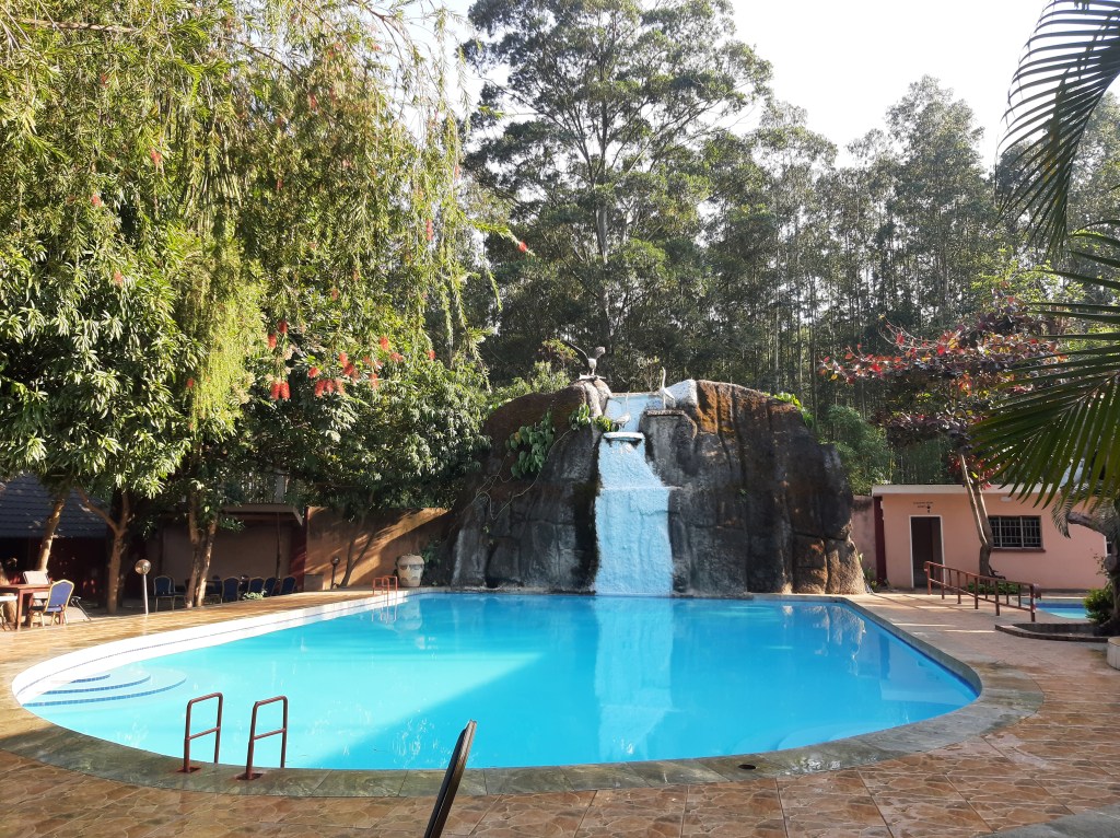 Ik word wakker in Mulanje waar ik op het werk had willen en moeten zijn. Ik geniet van het hotelontbijt en besluit dat mijn lichaam wat beweging nodig heeft en ik mijn bikini niet voor niets heb meegenomen. Dus ben ik om 8u30 baantjes aan het trekken in mijn ‘privézwembad’.
