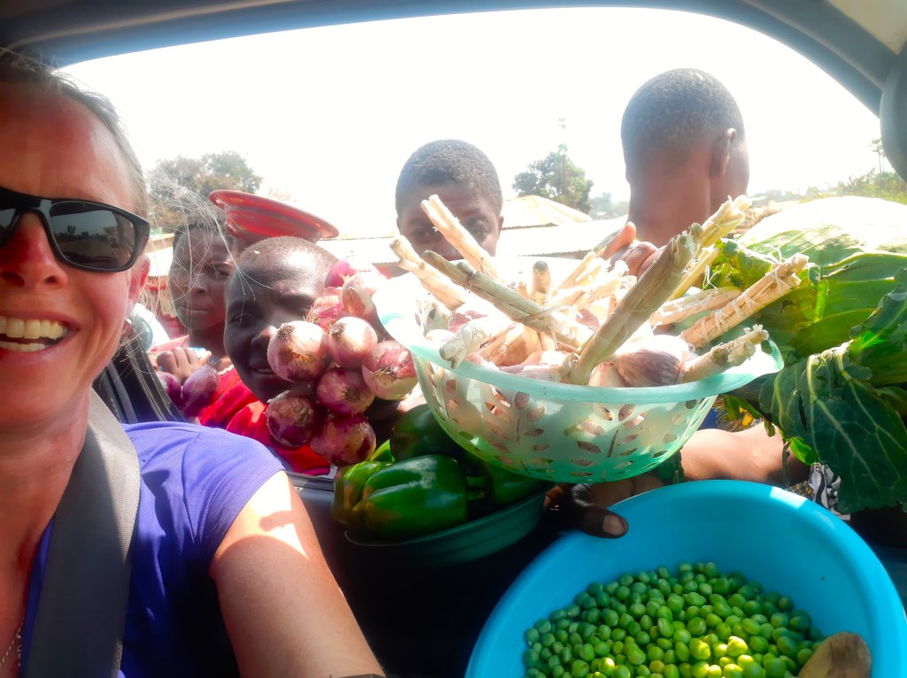 De vogels of kuikens laat ik voor wat het is en ik ga op jacht naar de volgende minibus. Nou ja zij op jacht naar mij. Ze vragen 8.000 ‘mzungu- Kwacha’, waar het 4.000 Malawische Kwacha kost, dus dat doen we niet! Voor 5.000 ga ik wel akkoord als ik voorin mag zitten en dat is snel geregeld. Wat ik niet doorheb is dat ik niet náást de ander voorin pas, maar in plaats van. Voor ik er erg in heb, wordt de passagier voorin UIT de bus gezet en ik erin.. en dat voor 1.000 extra (0,50). Ja die Malawiërs zijn heel lief, maar die azungu onbedoeld een trut!