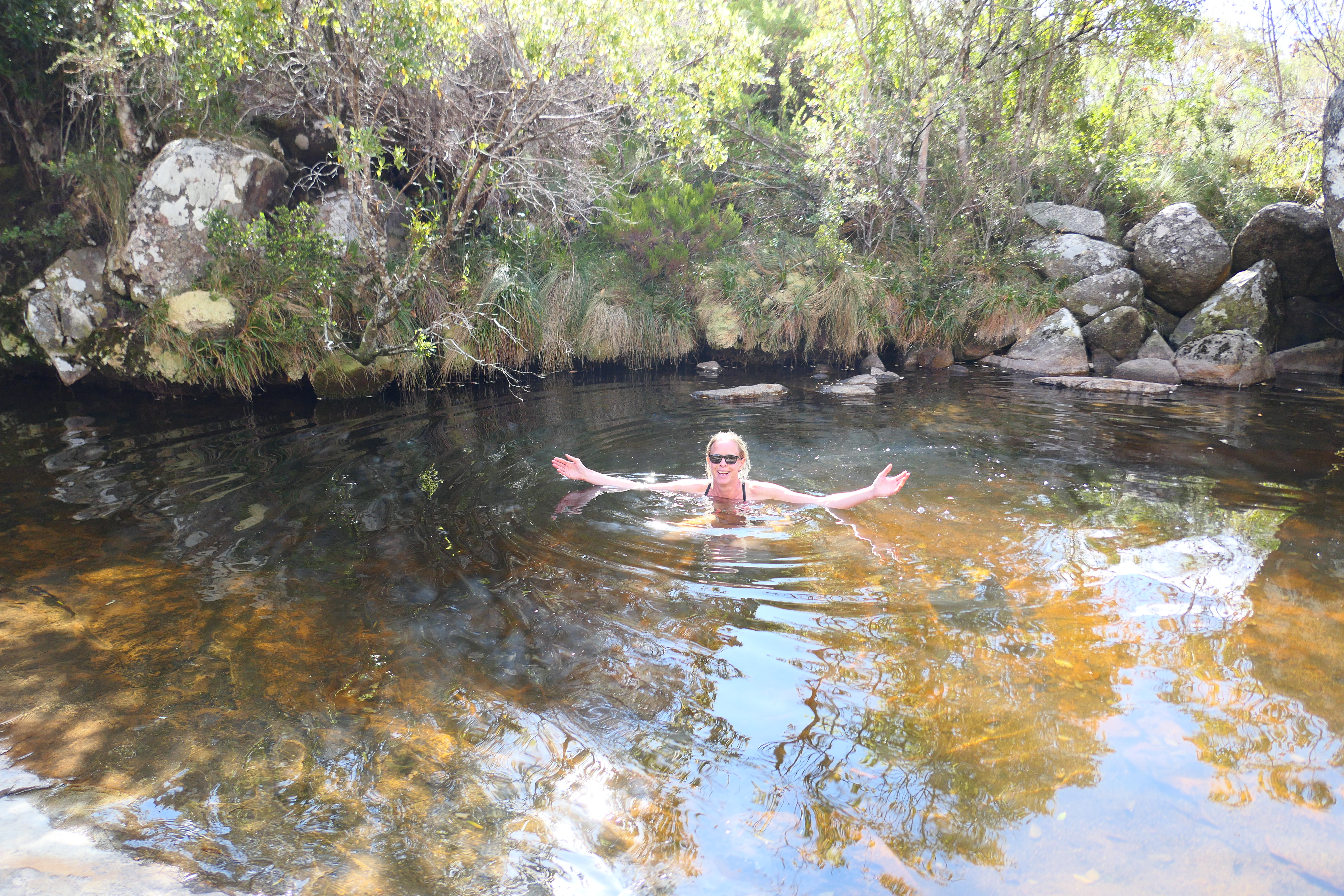 In Likhubula ontmoeten we onze gids, de drager is er nog niet, maar wij starten alvast met achterlating van onze grote rugzak. Het pad en de wandeling is niet vreselijk zwaar, alhoewel het ook weer geen wandeling in het park is, omdat het rotsig is dat soms best steil omhoog gaat. Hilgien heeft de vorige keer dat ze naar de Chisepo Hut liep de skyline wandeling gelopen, dus kiezen we het eerste deel een andere route langs de rivier met zijn mooie watervallen, stroomversnellingen, uitzichten en een slang(etje). Vroeg in de middag komen we aan bij de Chisepo Hut op ruim 2.200 meter hoogte. Zoals gewend wil Hilgien even zwemmen als beloning op een wandeling. Het water is hier echter een graad of 20°C verfrissender…