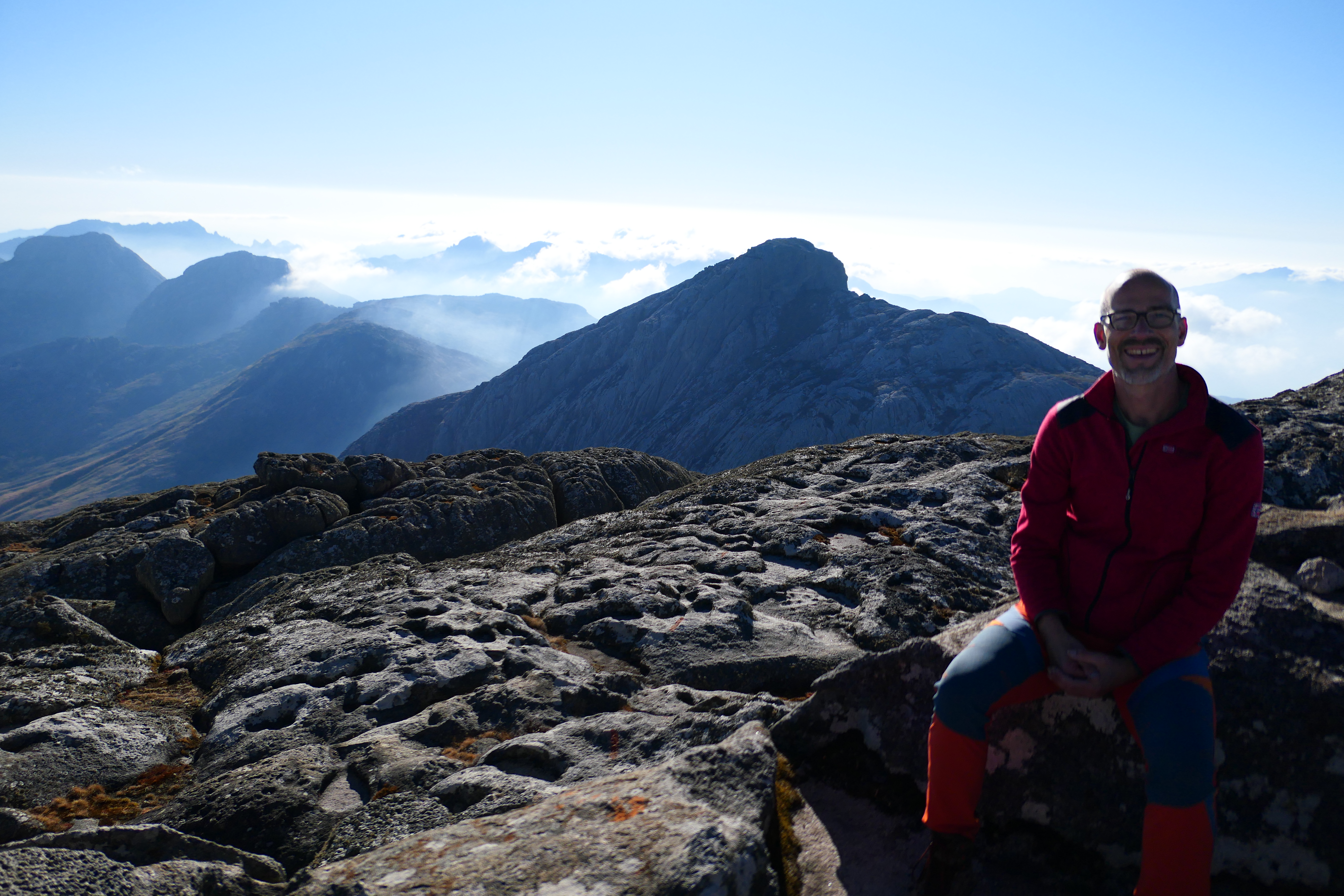 In het donker is het eerste stukje nog makkelijk, maar al snel wordt de klim naar de top steiler en rotsiger. Snel gaat het dus niet. Sterker, het gaat zo langzaam (het zou maar 2,5 km zijn!) dat het al snel duidelijk is dat we bij lange na niet de zonsopkomst gaan zien op de top. Maar uiteraard zien we tijdens de klim de zon wel opkomen en een voordeel is natuurlijk wel dat we met de zon zonder hoofdlamp onze weg wat makkelijker kunnen vinden. Het blijkt overigens dat de drager eigenlijk ook gids is en veel kan vertellen over de route en de omgeving. Bovendien is hij spraakzamer dan de gids die als gids fungeert en dus al snel die rol overneemt. Het laatste stuk naar de top is het klaar met wandelen. Het wordt klauteren over rotsblokken. En zelfs (uit)glijden, want er ligt vanaf ongeveer 2.800m rijp op de rotsen en begroeiing. Na 3,5 uur(!) klimmen en klauteren bereiken we de top; 3,5 uur over 2,5 km…!