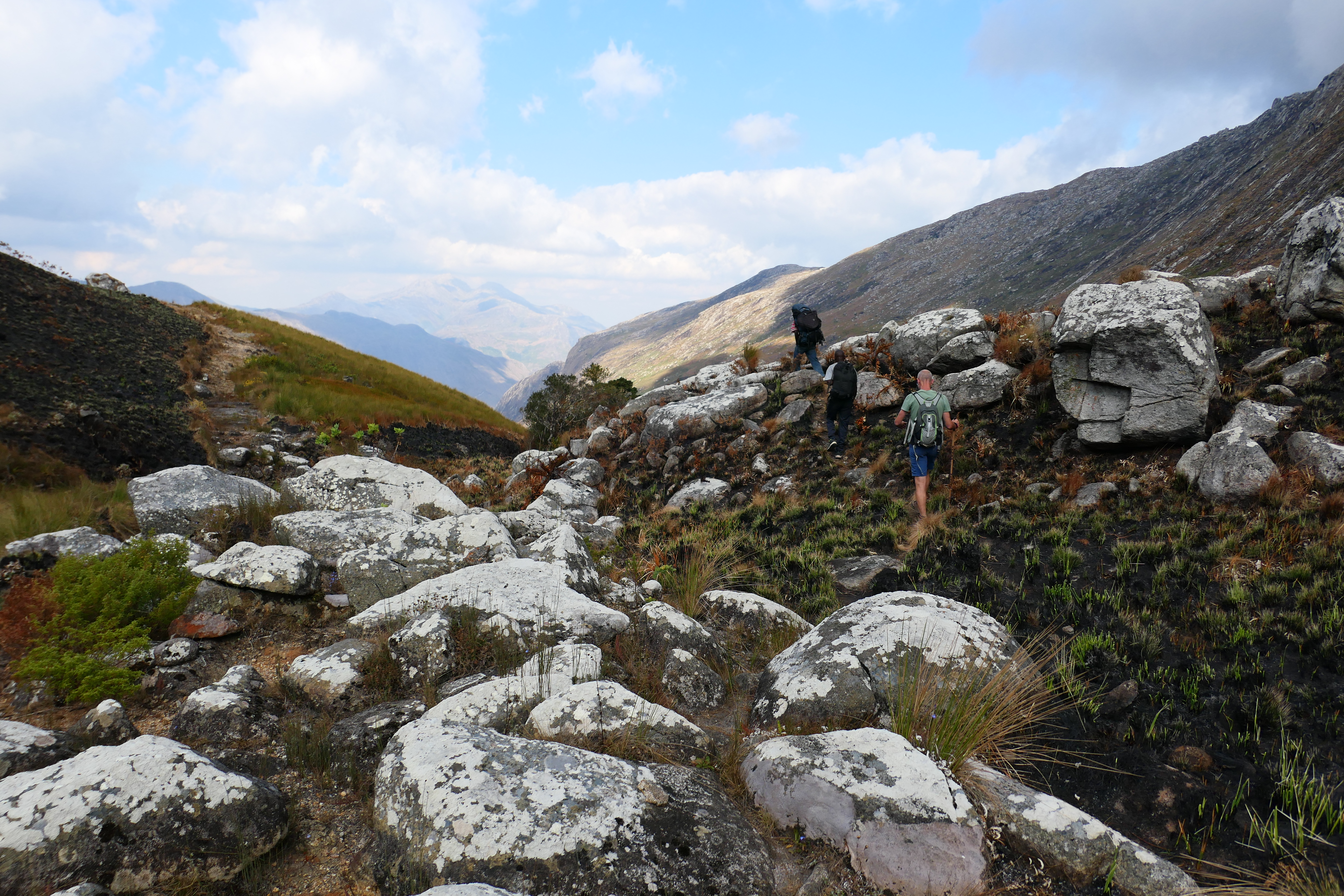Al keuvelend en wandelend begint er bij de gidsen toch een lichte ongerustheid te ontstaan, al proberen ze dat niet te laten blijken. Op een gegeven moment komt de aap uit de mouw: ze komen niet zo vaak op dit deel van het plateau. Wat heet: 23 jaar geleden voor het eerst en eh…. Voor het laatst! De route die gisteren goed gemarkeerd was, is op deze wat incourante route niet/nauwelijks gemarkeerd en overal lopen paden en paadjes gemaakt door mens en dier. Lang verhaal kort: we zijn verdwaald! Terwijl één van de gidsen probeert de route te vinden, pakken wij onze navigatieapp OsmAnd er maar eens bij. En die kan ons feilloos vertellen dat we aan de verkeerde kant van de vallei zitten. Shit! Dat betekent dat we een uur (!) moeten teruglopen. Oei, het was gezien de tijd al krap, maar nu wordt het echt een uitdaging!! En dus zetten we er flink de vaart in om zoveel mogelijk afstand af te leggen vóórdat het donker wordt.