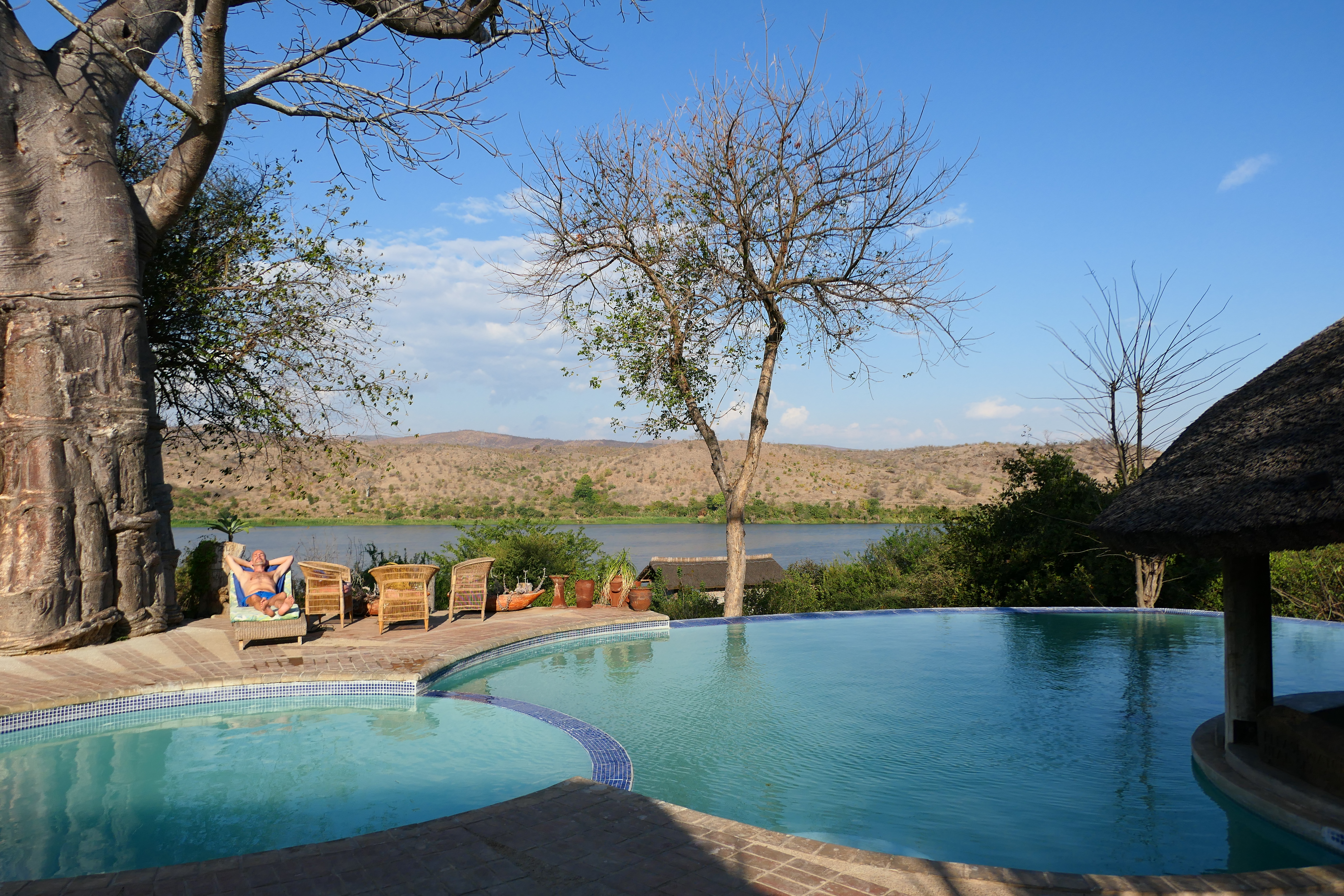 Enigszins bijgekomen van 3 dagen hiken, maar stijf van de spierpijn en toch ook wel wat andere pijntjes, nemen we afscheid van onze host Sylvester. Tot dan toe hebben we zijn omgeving vooral in het donker gezien, maar de omgeving met theeplantages en bergen is prachtig. We gaan op weg naar het Majete Reserve. Even iets minder in de actieve stand, maar vooral op zoek naar het wildlife van Malawi. Het park grenst aan Shire Rivier welke ontspringt uit het Lake Malawi en in Mozambique uitmondt in de Zambezi rivier. Nadat we ons door de verkeersdrukte van Blantyre hebben geworsteld, komen we op een plateau, vanwaar we de vallei van de Shire rivier kunnen zien. Deze vallei is de heetste plek van Malawi omdat deze het laagst gelegen is, maar gelukkig is het nu bij lange na nog niet de warmste tijd van het jaar en dus valt de hitte mee. De lodge is een hele mooie plek met zwembad en baobabs en (om te beginnen) flink wat vogels. We slapen in een tent. Ruimte zat en prima voor één of twee nachten, maar verwacht vooral geen plek om spullen neer te zetten (tafel, kast, haken, lijnen, o.i.d.), dus we gebruiken onze auto maar als driving closet.
